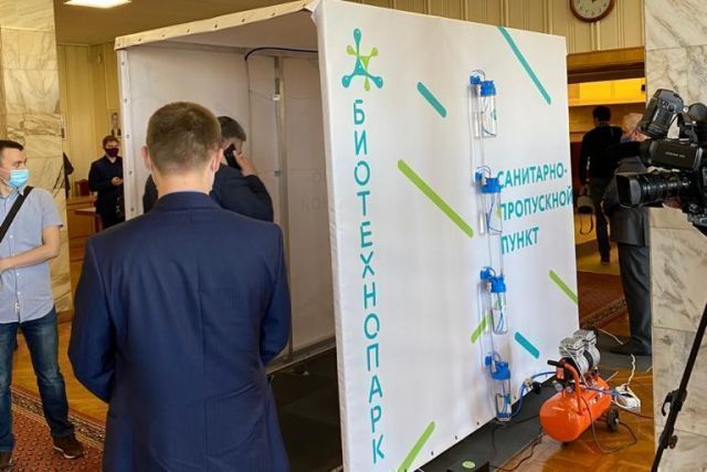 Установка разработана резидентом «Биотехнопарка» компанией Spectromart. Конструкторское бюро было создано в конце 2019 года. В самом начале периода самоизоляции там было принято решение создать устройство, которое позволяло бы снизить вероятность переноса инфекции в те места, посещение которых невозможно запретить.