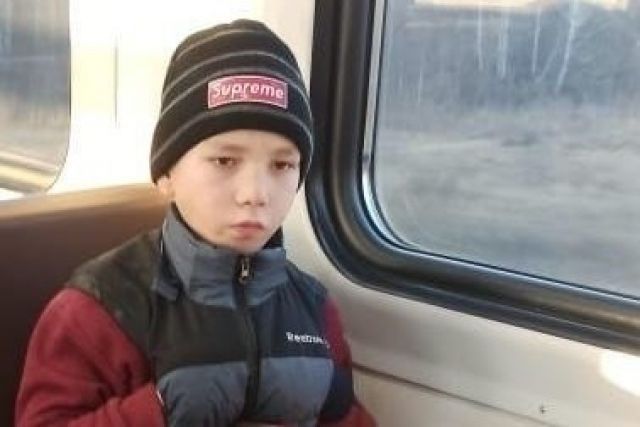 Мальчик одет, как и на фото: сине-черный жилет, бордовая кофта, черная с серыми полосками шапка, черные штаны, черные кроссовки. С собой у него был самокат.