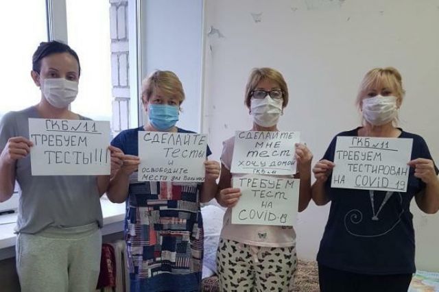 Именно поэтому прямо на больничных койках женщины соорудили из подручного материала плакаты. Слоганы простые: «Сделайте мне тест. Хочу домой» и «Требуем тестирования на COVID-19». Утомлённые ожиданием пациенты надеются, что на них после этого обратят внимание.