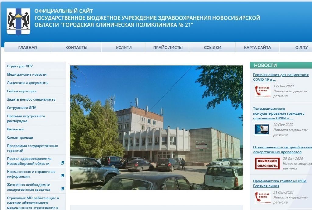 1. Заходим на сайт своей поликлиники по месту жительства. В нашем случае это поликлиника №21 Кировского района. Кнопки записи к врачу не видна. Сначала надо догадаться, что она все-таки есть внизу сайта, а потом еще скроллить. Жмем кнопку «запись на прием к врачу онлайн”
