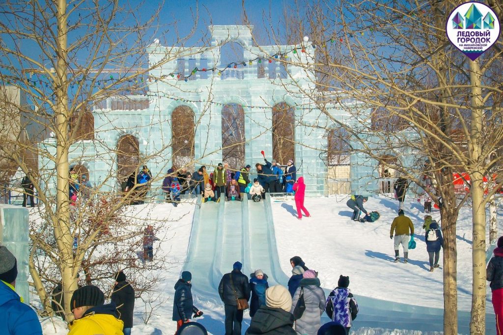 В этом году тематика аттракциона на Михайловской набережной. – «Новогодние фантазии». Гостей за входной дворцовой аркой встретят персонажи зимних сказок и мультфильмов, символы Нового года и предстоящих важных событий. Сам аттракцион состоит из разнообразных горок, обрамленных башенными куполами, с 11-ю скатами. Самая большая горка – высотой 8 метров и длиной ската 70-80 метров.