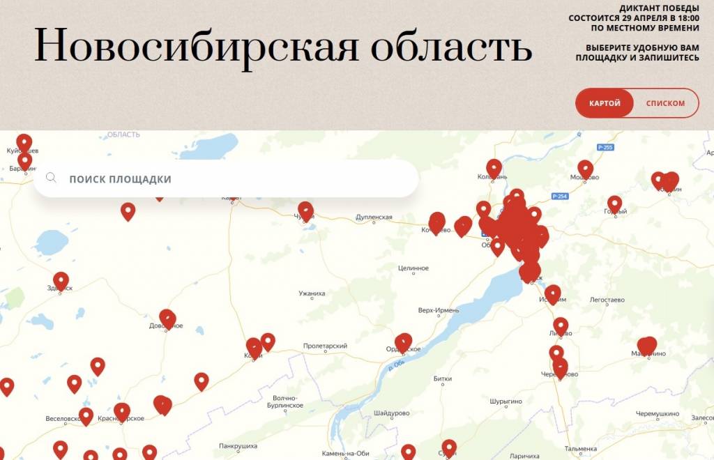 Площадки Диктанта Победы размещены в школах, лицеях, колледжах Новосибирска, и других городов и населенных пунктов области. На сайте диктантпобеды.рф можно ознакомиться с полным списком адресов – их 282 на территории Новосибирской области. Площадки диктанта представлены на сайте списком и на карте. Выберите удобную для вас площадку и запишитесь на Диктант Победы.