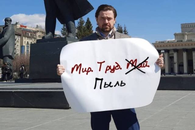 Аксёненко вышел с плакатом «Мир.Труд.Пыль» 1 мая на площади Ленина, назвав мероприятие «депутатской одиночной маевкой».