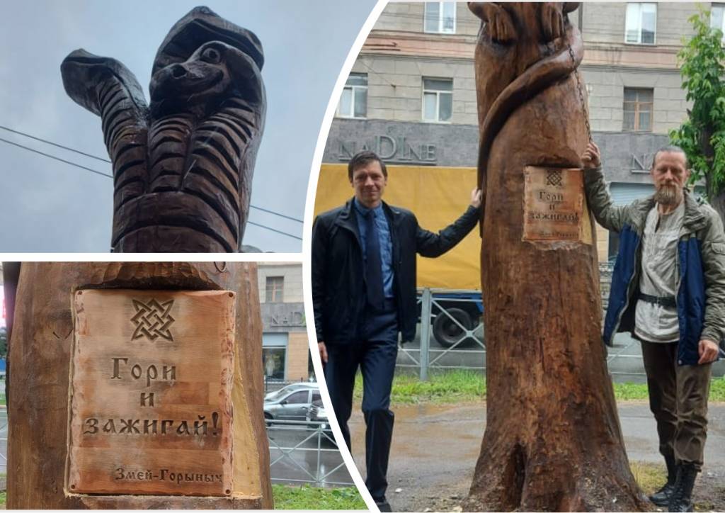 — Скульптура создавалась сложно, под дождём. На лесах было не очень удобно стоять. Довольно шаткая конструкция, но мы победили, – признался скульптор Илья Давыдов. — Работать пришлось бензопилой, а потом обрабатывал болгаркой. Формы нам подсказало само дерево: было четыре ствола, и из них было решено сделать Змея Горыныча. Лозунг «Гори и зажигай» — это нормальная позиция: гори сам, гори своим делом, гори своим творчеством и зажигай всех на новые свершения.