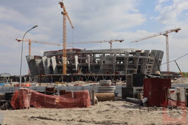 – На сегодняшний день полностью выполнены следующие виды работ: обустроено свайное основание, 1513 свай, возведен железобетонный каркас арены, смонтированы металлические конструкции кровли и фасада малых арен, смонтированы перекрытия основной арены и обустроены наружные сети отопления. По выполняющимся работам: продолжается завоз песка на объект. Общий его объем, если включать дороги – полтора миллиона кубометров. Идет монтаж металлоконструкций периферийной зоны и основной арены – он выполнен на 91 процент, огнезащитные металлоконструкции выполнены на 80 процентов, монтаж профлиста – 66 процентов. Также выполняются работы по монтажу фасада основной арены, ведется монтаж расположенных отдельных от объекта билетных касс и зон досмотра, – доложил Иван Шмидт.