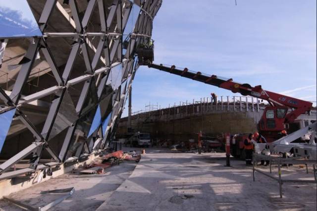 На этой арене следующим летом уже начнут устанавливать на трибунах кресла. А тем временем, на большой арене ЛДС уже устанавливают витражи. Практически каждое витражное стекло – уникально. Одинаковых по размеру на несколько тысяч квадратов остекления найдется разве что несколько пар, уверяют строители. Вес «кусочков» этой мозаики на малой арене – около 80 килограммов, на основной – до 130-ти. Витражи займут в корпусе ЛДС более 11 тысяч квадратных метров.