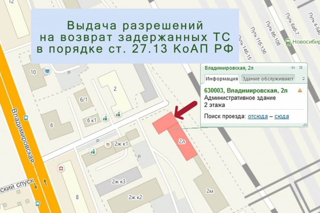 – С 4 ноября выдача разрешений, задержанных транспортных средств в порядке статьи 27.13 КоАП РФ, будет осуществляться по адресу: г. Новосибирск, улица Владимировская, 2л (вход со стороны железнодорожных путей) режим работы с 9:00 до 21:00 без выходных, – сообщают в отделе пропаганды ГИБДД Новосибирска.