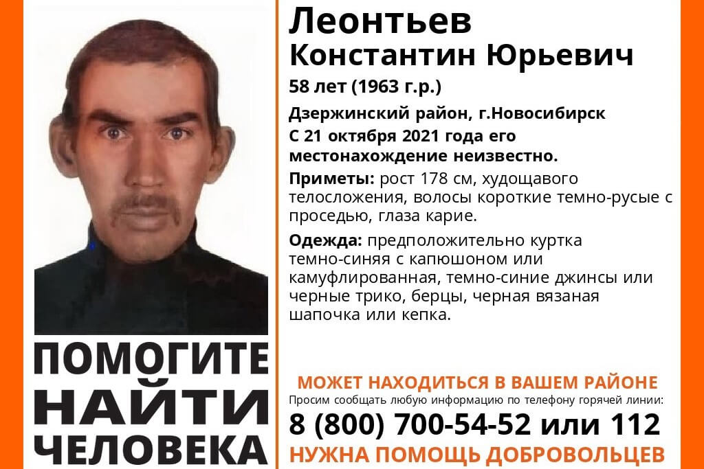 Уточняется, что житель Дзержинского района Новосибирска Константин Леонтьев пропал еще 21 октября. С этой даты о местонахождении мужчины ничего не известно.