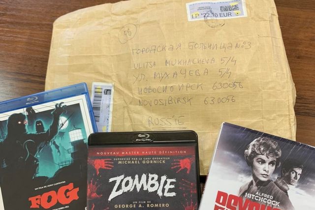 На фотографии видно, что из Франции в Новосибирск прибыли три диска с достаточно известными фильмами: «Зомби», «Туман» и «Психо». За пересылку «подарка» отправитель заплатил 22 евро. На данный момент сотрудники ковидного госпиталя гадают, кто же все-таки прислал эту посылку и с какой целью.