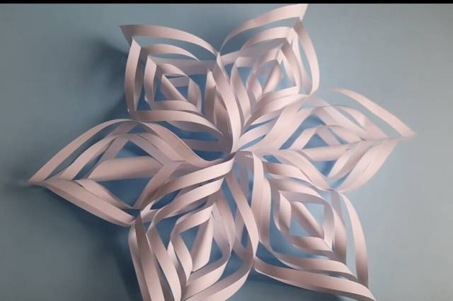 ШАГ №5. После того, как вы сделаете 6 таких лучей, можно начинать собирать объемную снежинку, склеивая боковые части лучиков. Важно отметить, что делать эту нужно в самой широкой части, а потом верхушками. После того, как удастся склеить между собой все лучи, окончательный вариант снежинки будет готов.