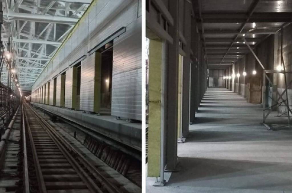 На краях платформы будут установлены глухие перегородки из сэндвич-панелей, они обеспечат безопасность пассажиров на станции. В панелях расположат раздвижные двери — они будут открываться вместе с дверями поезда. Монтаж сэндвич-панелей на станции уже завершен на 95%.