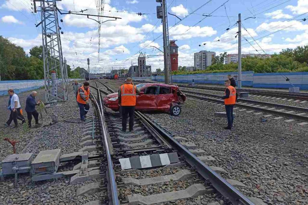 Уточняется, что инцидент произошел днём 6 июня рядом с бердской железнодорожной станцией. Автомобилист за рулем японской иномарки пытался тормозить, но электричка всё равно зацепила машину.