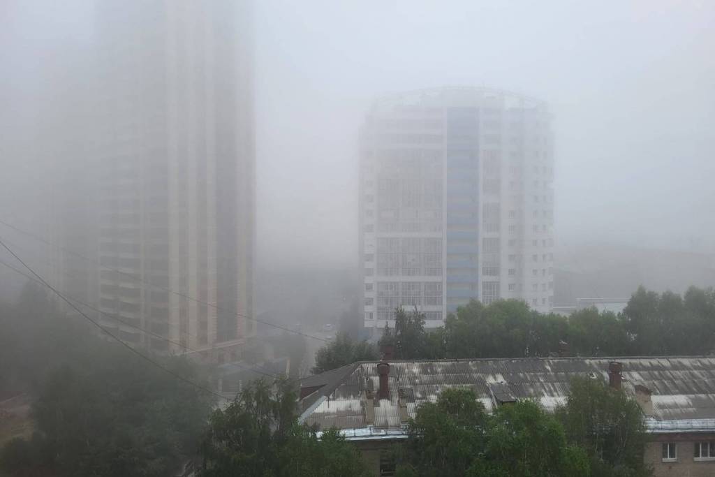 Густой туман накрыл город рано утром, примерно в 6 часов. Завораживающее зрелище продлилось ориентировочно до 10:30, после чего дымка сошла на нет.