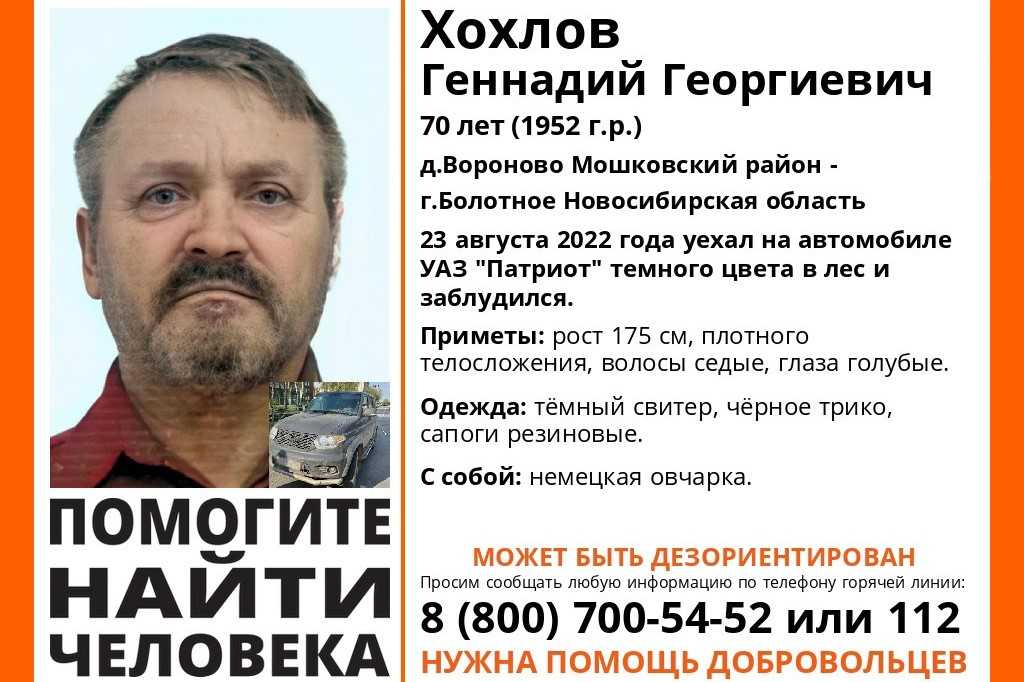 Напомним, что 23 августа мужчина пропал между населенными пунктами: деревня Вороново Мошковский район – город Болотное. Пенсионер уехал в лес на своем автомобиле марки «УАЗ Патриот» и заблудился. С собой мужчина взял немецкую овчарку.