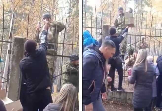 На кадрах видно, что у забора находятся около десяти человек, которые передают военным пакеты и коробки с едой, а также бутылки с компотом. При этом, сами мобилизованные по ту сторону забора говорят, чтобы люди несли еду домой, так как проблем с питанием у них нет.