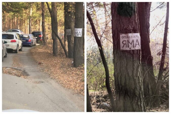 – В Заельцовском парке решили обезопасить водителей новым способом. Как сообщают подписчики, ремонт сделали на участках дороги, которые были не особо повреждены. Зато оставили яму, которую ночью и под лужами не видно, и наклеили на деревья такие «информационные» таблички, – говорится в сообщении.