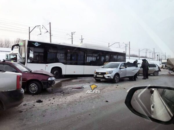 – На улице Первомайской участники аварии стали бортовая ГАЗель, компактный автомобиль Mazda Demio, седаны Renault Logan, и Daewoo Nexia, универсал LADA Vesta, микроавтобус и контейнеровоз, который съехал с дороги и стал виновником аварии, – говорится в сообщении в паблике АСТ-54.