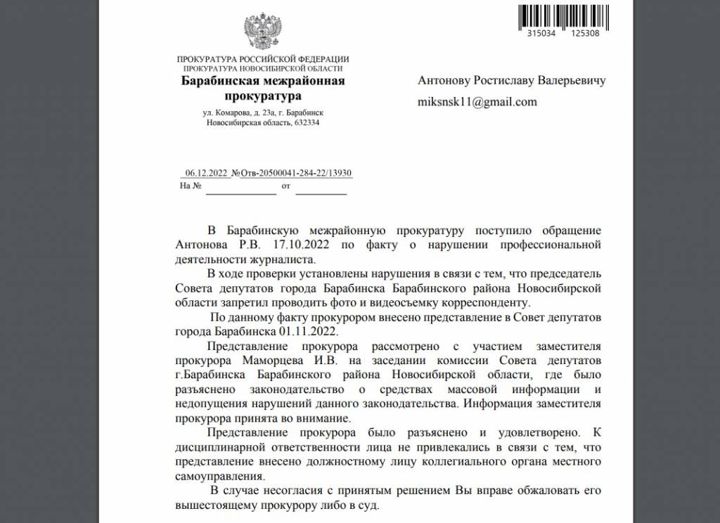 В надзорном ведомстве по обращению Антонова провели проверку, в ходе которой были установлены нарушения со стороны председателя Совета депутатов Барабинска в связи с запретом корреспонденту проводить фото и видеосъемку.