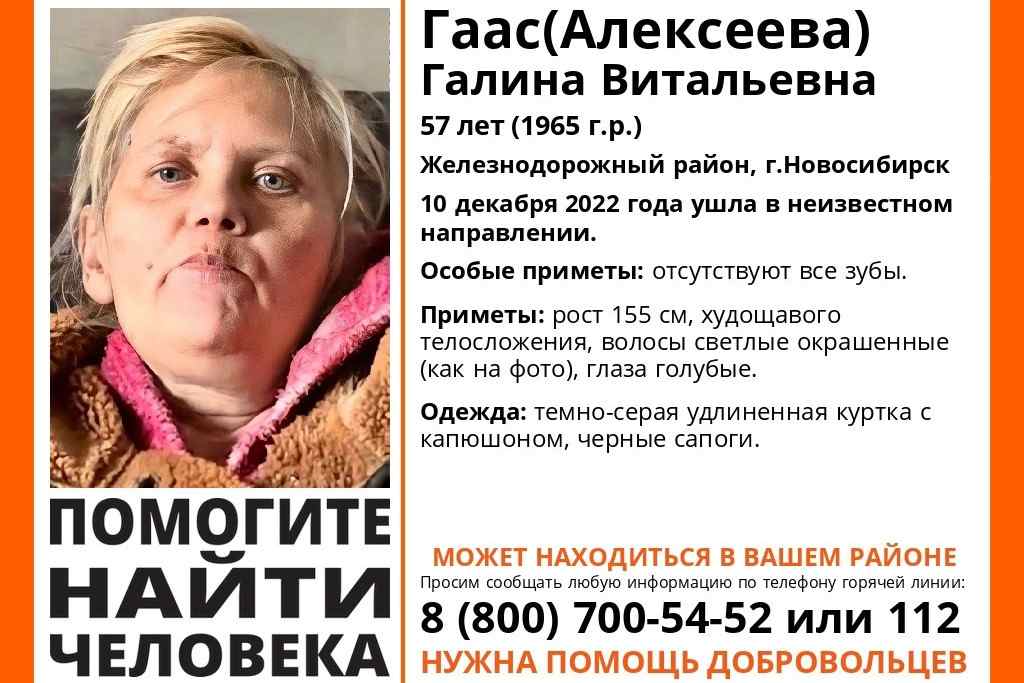 Всех тех, кому что-либо известно о местонахождении Галины Гаас, волонтеры отряда просят сообщить об этом по номерам телефонов: 8-800-700-54-52 или 112.