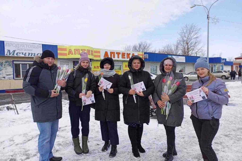 Волонтеры, ребята из молодежных объединений и молодогвардейцы дарили женщинам на улице цветы и открытки с пожеланиями к 8 марта.