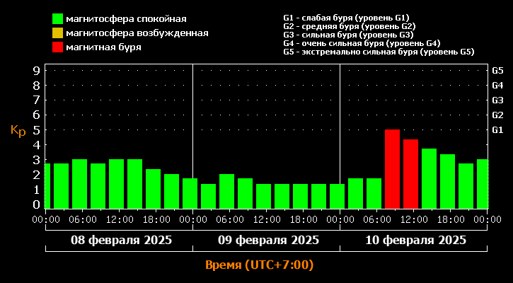 Колебания в магнитосфере ожидаются в понедельник, 10 февраля. Самый пик придется на 9 утра, сила достигнет отметки G1 (слабая буря). К обеду магнитосфера придет в норму.