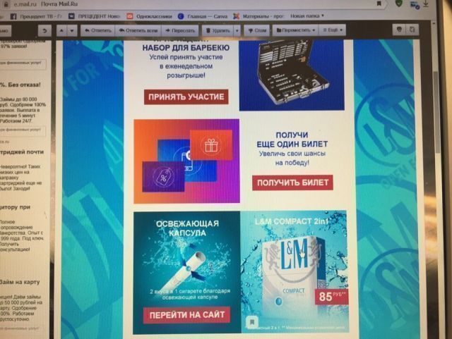 В письме приводилось изображение пачек сигарет L&M и текст с описанием товара. Корреспондент программы «Прецедент» тоже нашёл в своём ящике на mail.ru похожие письма(фото).