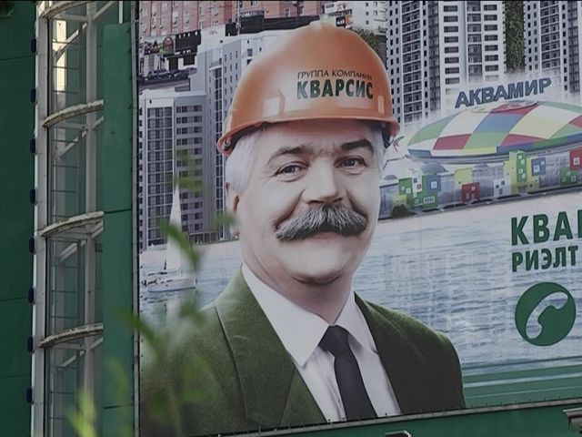 В этой «наружке» прекрасно всё: и обаятельный «строитель», и панорама за его плечами с аквапарком и жилыми новостройками, символизирующими успешность девелопера… Смущает лишь то обстоятельство, человек с рекламного баннера умер ещё три года назад. И это никакой не строитель, и даже не сотрудник «Кварсиса».