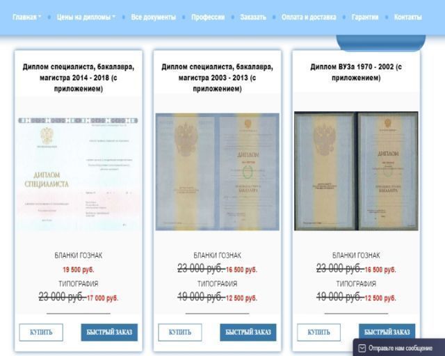 Журналисту «Прецедента» не составило труда зайти на него и ознакомиться с запрещенным предложением. Чего там только не оказалось: дипломы училищ и вузов по самым разнообразным специальностям от «монтажника» и «швеи» до «логопеда», «биолога» и даже «переводчика»! Среди заманчивых псевдо образовательных предложений затесалась даже такая опция для современных недорослей как «аттестат о среднем образовании за 11 классов».
