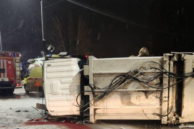 В Новосибирске мусоровоз, врезавшись в столб, перевернулся на скользкой дороге