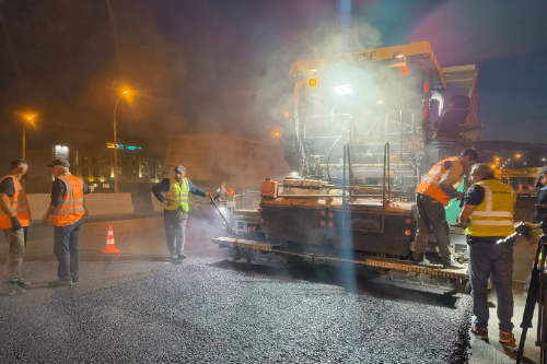 Подрядчик укладывает верхний слой дорожного покрытия.
