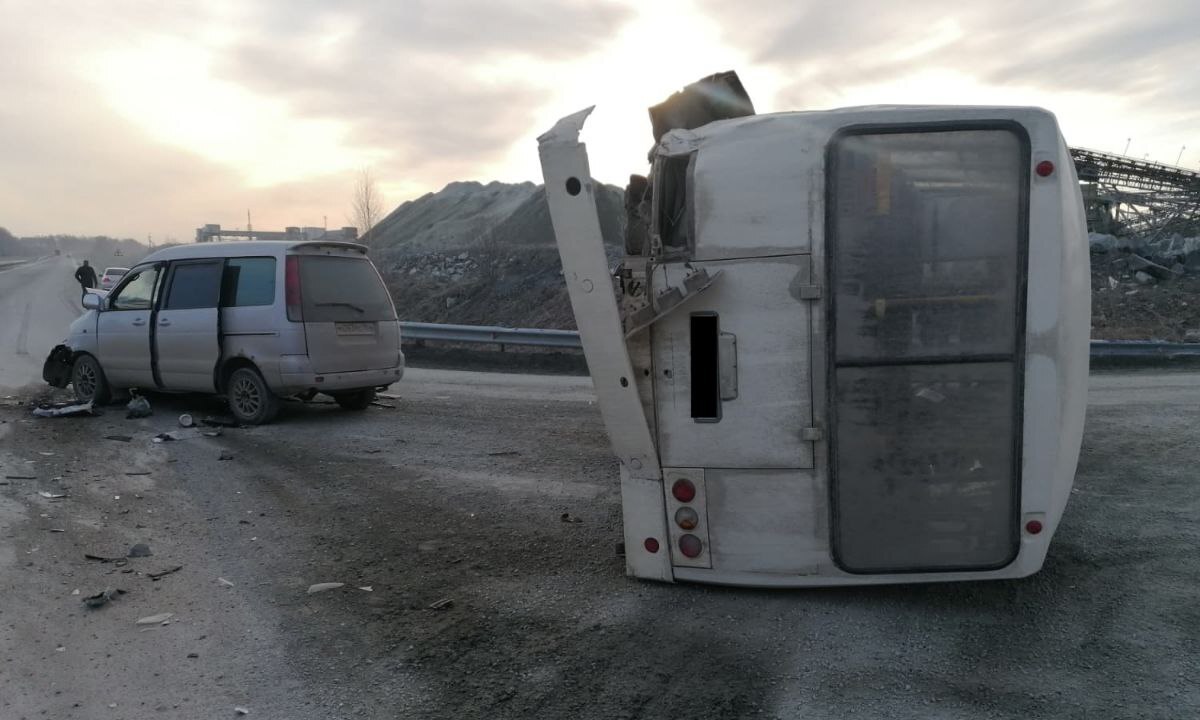 Авария произошла на трассе К-16. В результате столкновения пассажирский автобус перевернулся.