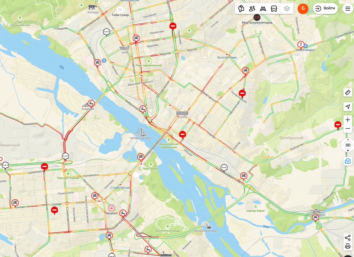 Затруднено движение на Красном проспекте, Большевистской, Сибиряков-Гвардейцев и на других улицах. Кроме того, на Октябрьском и Димитровском мостах также образовался затор.
