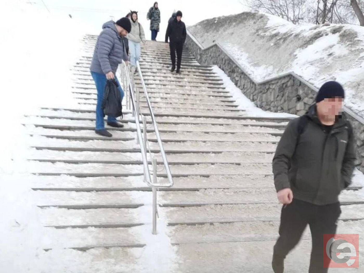 В Новосибирске местный жители пожаловались на опасную горку, которая образовалась на месте лестницы на Речном вокзале со стороны улицы Восход. Как «Прецеденту» сообщила Галина В., прохожим приходится помогать друг другу взбираться по заснеженным ступенькам.