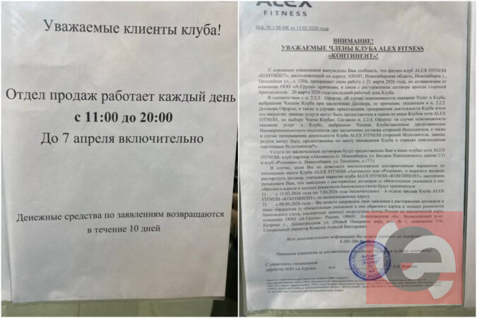 21 марта фитнес-клуб «Alex Fitness» в ТЦ Континент на улице Троллейная, 130а объявил о своем закрытии. Клиентам предоставили выбор: расторжение договора или предоставление услуги в других филиалах в Новосибирске.