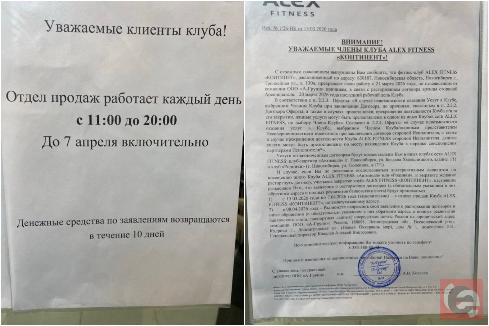 В ВК-группе фитнеса-клуба сказано, что заявления о расторжении договора принимаются с 15 марта по 7 апреля в отделе продаж «Alex Fitness» в торговом центре Континент, а с 8 апреля почтовым отправлением на юридический адрес компании.