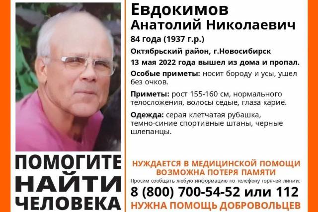 В Октябрьском районе Новосибирска пропал 84-летний Анатолий Евдокимов. Объявлен старт поисков мужчины. Об этом сообщили в группе поискового отряда «ЛизаАлерт» социальной сети «ВКонтакте».