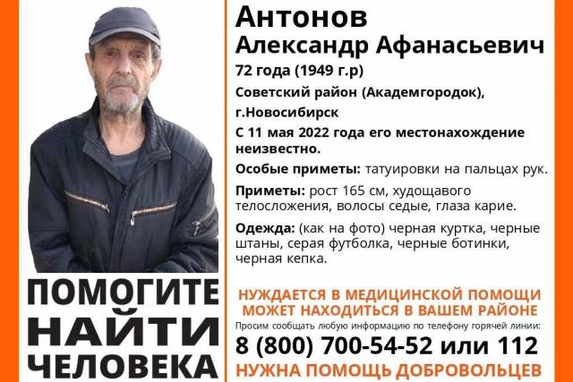 В Советском районе Новосибирска (Академгородок) пропал 72-летний Александр Антонов. Объявлен старт поисков мужчины. Об этом сообщили в группе поискового отряда «ЛизаАлерт» социальной сети «ВКонтакте».