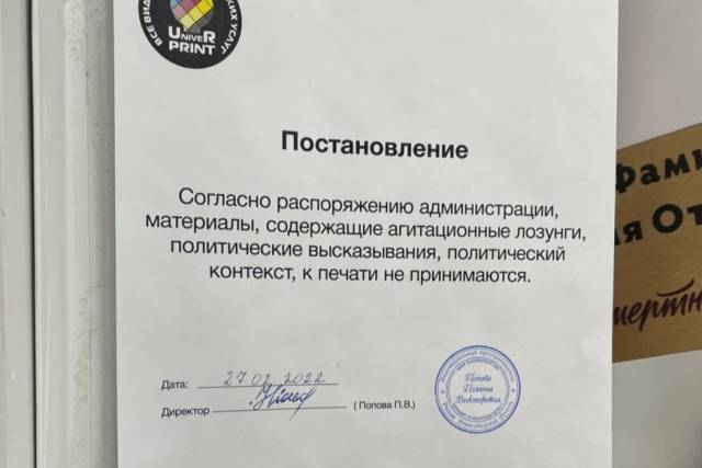 Популярная полиграфическая студия в новосибирском Академгородке сообщила клиентам о том, что не будет выполнять заказы, связанные с политическими процессами. В филиалах студии разместили соответствующие объявления.