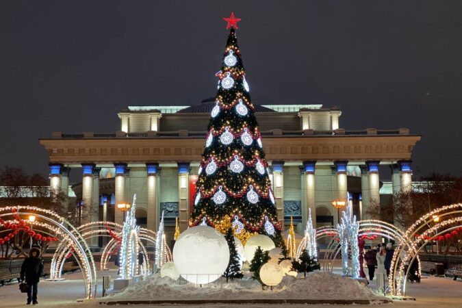 В Первомайском сквере новосибирцев встречает светодиодный фонтан, снежинки, гигантские шары и деревья, украшенные гирляндами.