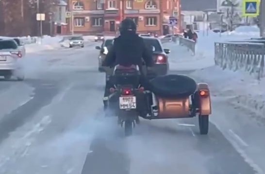 Другой мотоциклист проехал по улицам на «Урале» с коляской в минус 28.