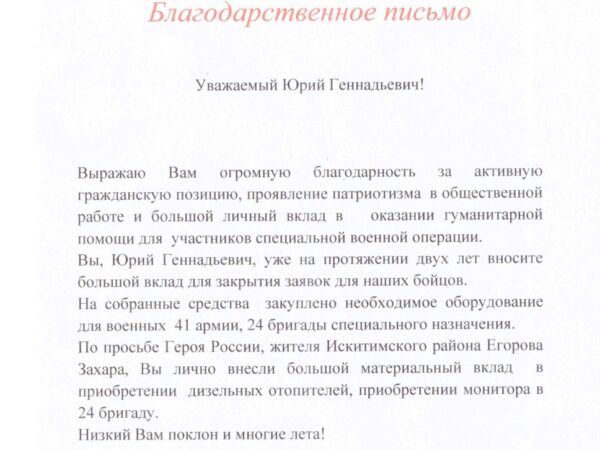 В списке характеризующих материалов: обращение в поддержку Юрия Добкина жителей деревни Харино, под которым подписалось больше половины ее населения. Есть также благодарности из зоны СВО — от бойцов 24 бригады СпН, для которых Добкин помог приобрести дизельные генераторы и монитор.