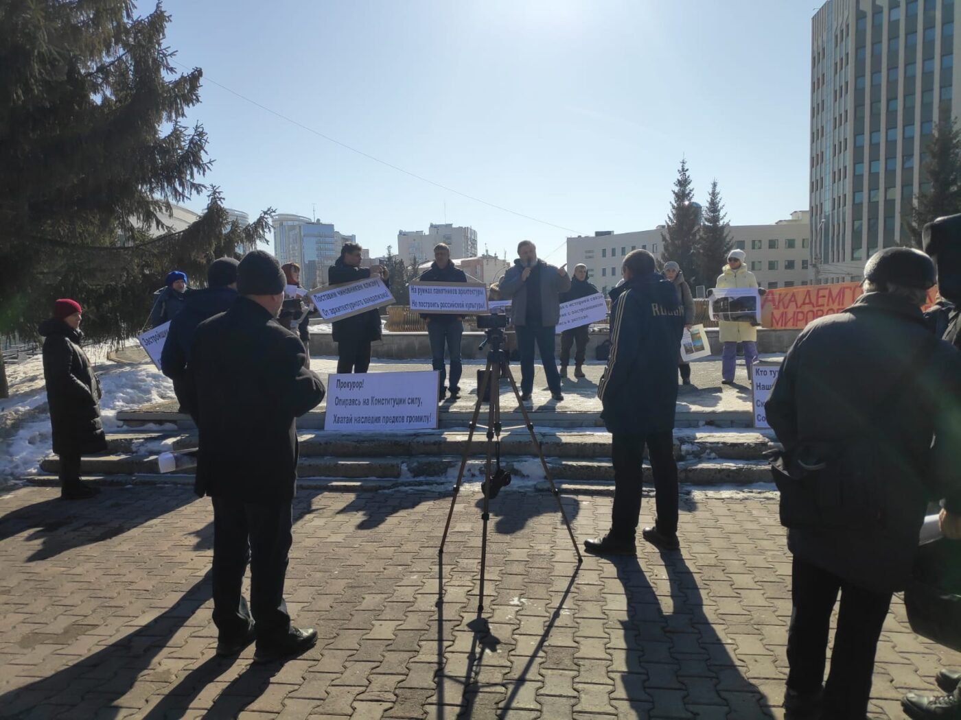 «Разрушая с историей связи, чиновник с застройщиком слились в экстазе», «Эй, товарищ прокурор, загляни-ка за забор», «На руинах памятников архитектуры не построить российской культуры» — с такими лозунгами вышли активисты на площадь перед «Глобусом». Таким способом участники митинга пытались привлечь внимание надзорных органов к уничтожению культурного наследия в угоду застройщикам.