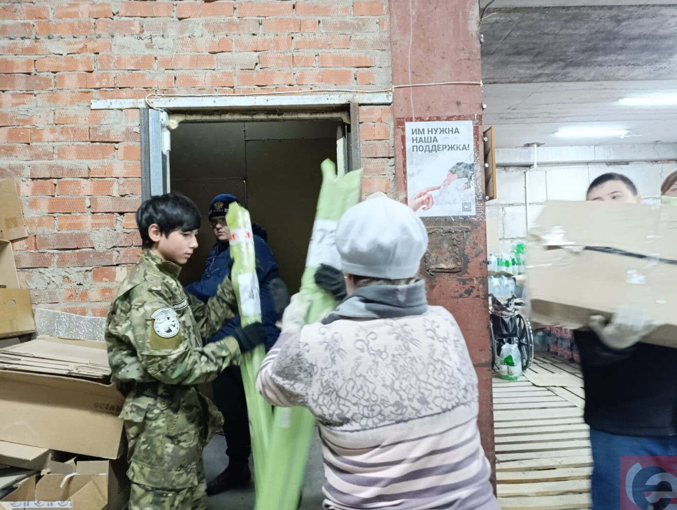 На складе Благотворительного фонда «К Победе вместе» в этот день было необычайно многолюдно. Студенты, активисты различных общественных организаций, члены ТОС и просто неравнодушные люди грузили упаковки с водой и соками, продукты. Мужчины покрепче споро передавали по цепочке автомобильные покрышки, запчасти. Работали под духовой оркестр – все-таки праздник. Музыкальное сопровождение обеспечили учащиеся музыкальной школы №3. А их родители в это время также принимали участие в погрузке.