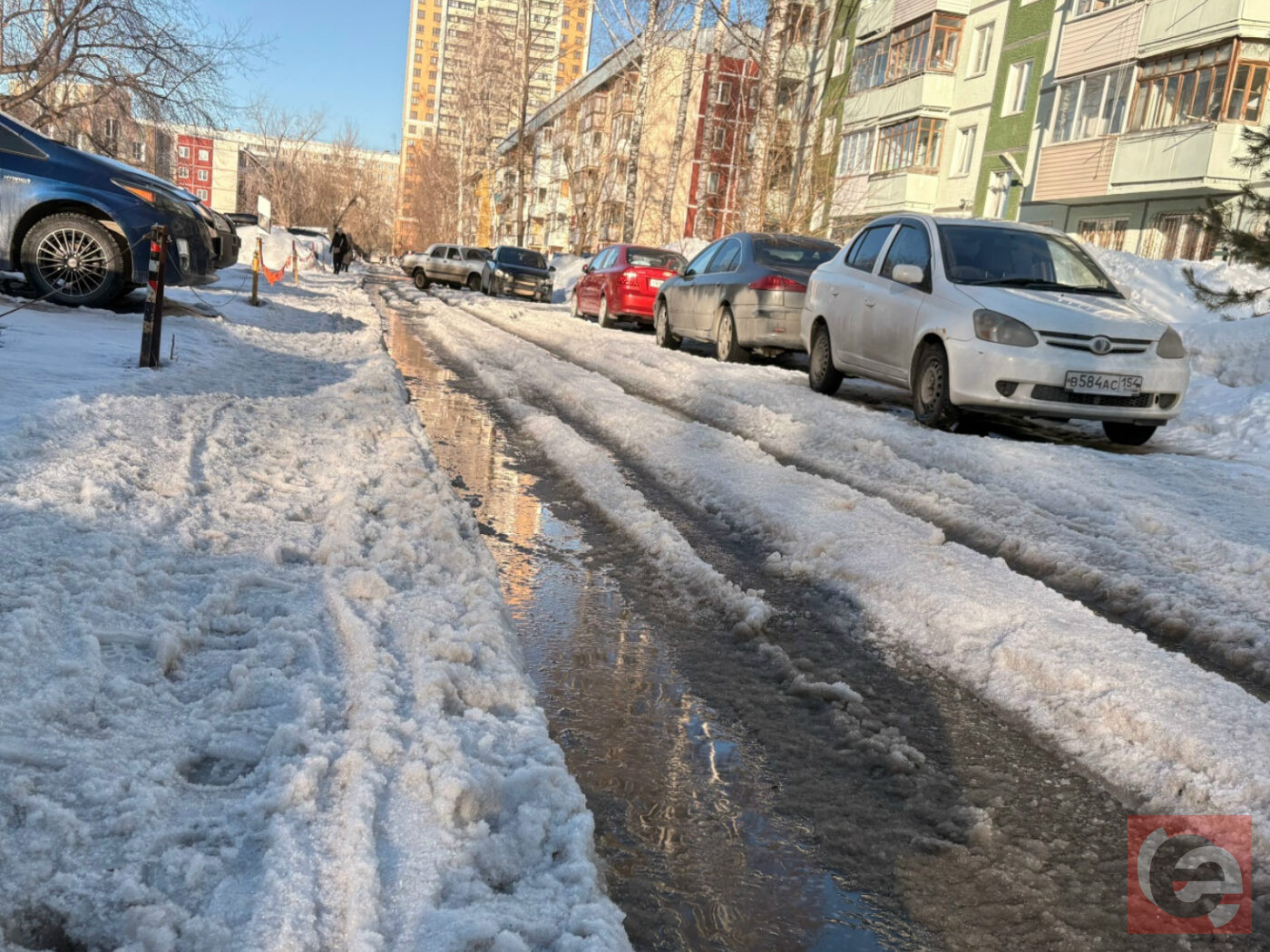 — Вчера машины стояли в воде, заехать в ЖК было тем еще испытание — три автомобиля забуксовали. Слава Богу хоть тротуар более менее в пригодном состоянии, а то пришлось бы на лодках выбираться отсюда. Сегодня уже расчистили это месиво, но снег здесь будет еще долго таять, — негодует местных житель Антон Курленя.