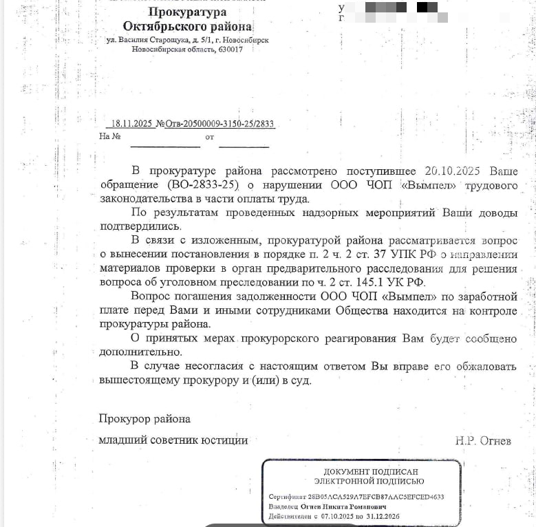 В октябре 2025 года Ирина К. пошла в прокуратуру. В ходе проведённых ведомством надзорных мероприятий факты подтвердились.