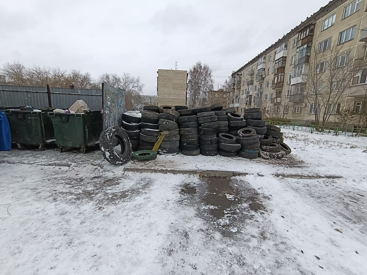 Свалку старых покрышек обнаружили на контейнерной площадке дома по ул. Киевской, 15 в Ленинском районе Новосибирска. За ночь рядом с контейнерами для твердых бытовых отходов появились около стони бывших в употреблении автомобильных шин. Местные жители полагают, что это – отходы производства какого-то СТО.