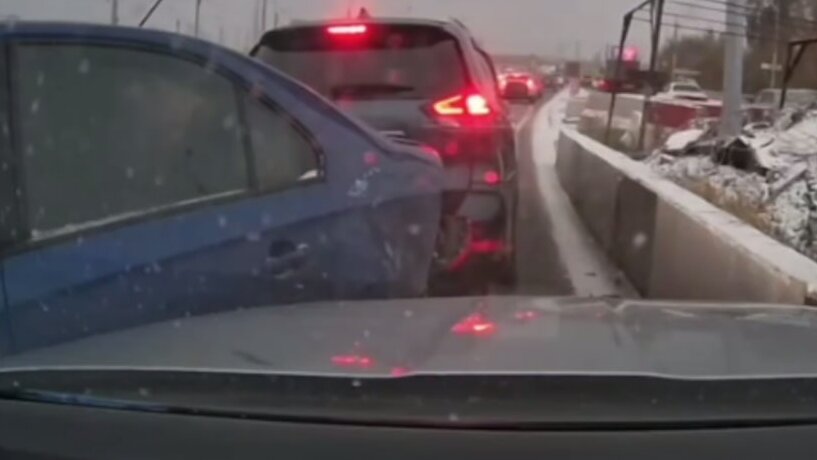 На кадрах видно, как синяя иномарка отскочила от дорожного ограждения и врезалась в машину, что стояла перед ней. Затем автомобиль, водитель которого поделился записью с видеорегистратора, скользя по дороге, не смог вовремя остановиться и ударился об задний бампер синей иномарки. Однако кадры, как въехал четвертый автомобиль на камеру не попали.
