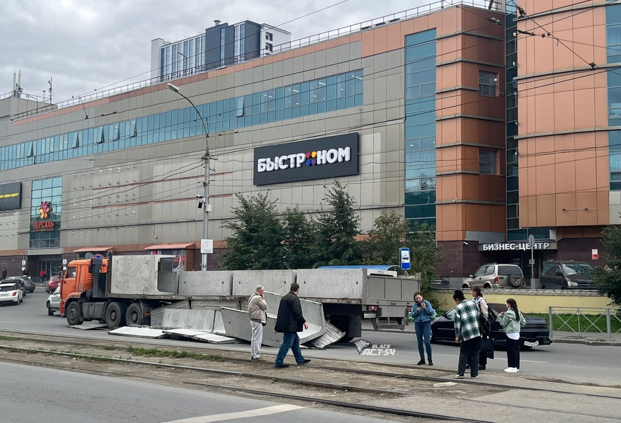 Прохожие, оказавшиеся утром 1 сентября на улице Блюхера, чудом остались живы. Проезжающий по улице тягач «потерял» по дороге несколько огромных бетонных плит. Информацию о произошедшем публикует телеграм-канал АСТ-54.