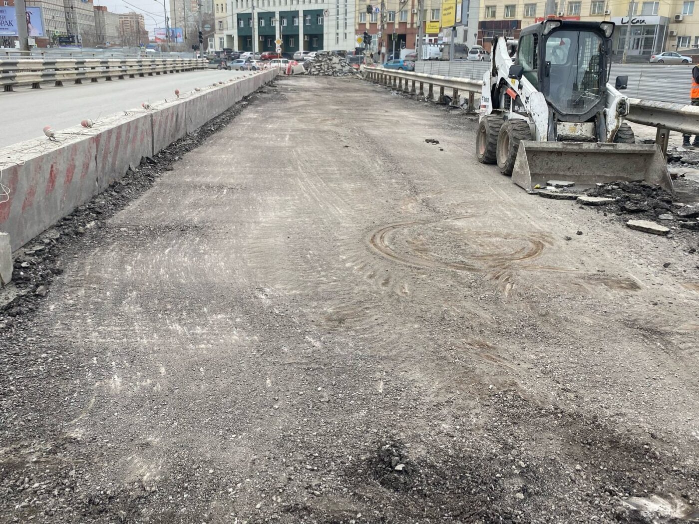 На путепроводе по улице Фрунзе завершают разбор старой дорожной одежды и параллельно проводят работы по сооружению нового выравнивающего слоя бетона.
