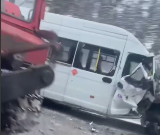 Как видно на кадрах, у микроавтобуса разбита передняя часть. Авария произошла в крайнем левом ряду. У пользователей соцсетей сразу возникли вопросы, как там оказался общественный транспорт, который должен двигаться по правому ряду и, тем более, гусеничный трактор, который, судя по видео, вообще стоит на «встречке».